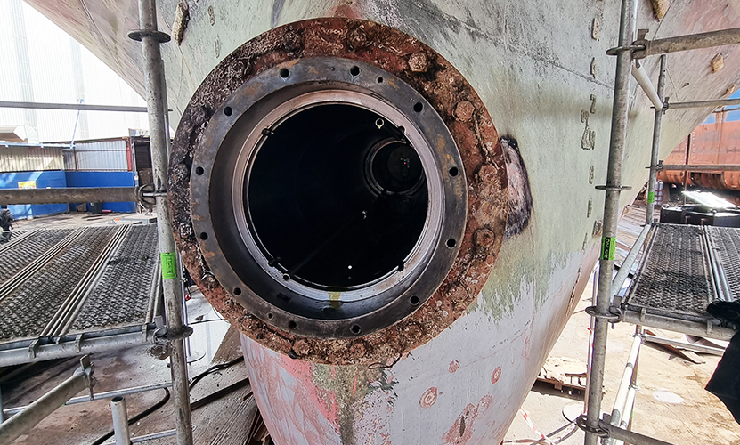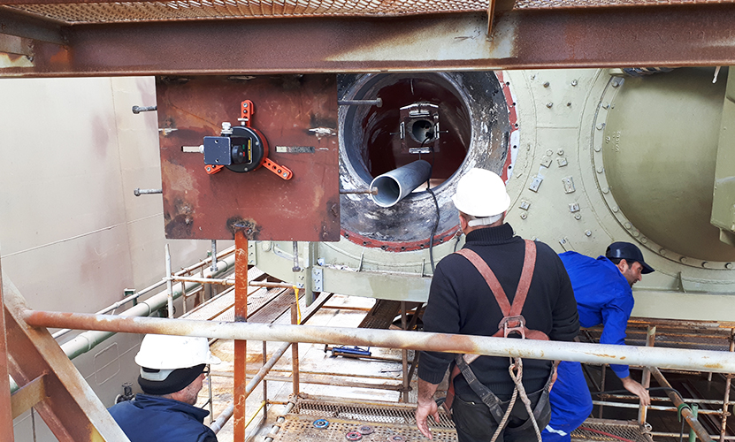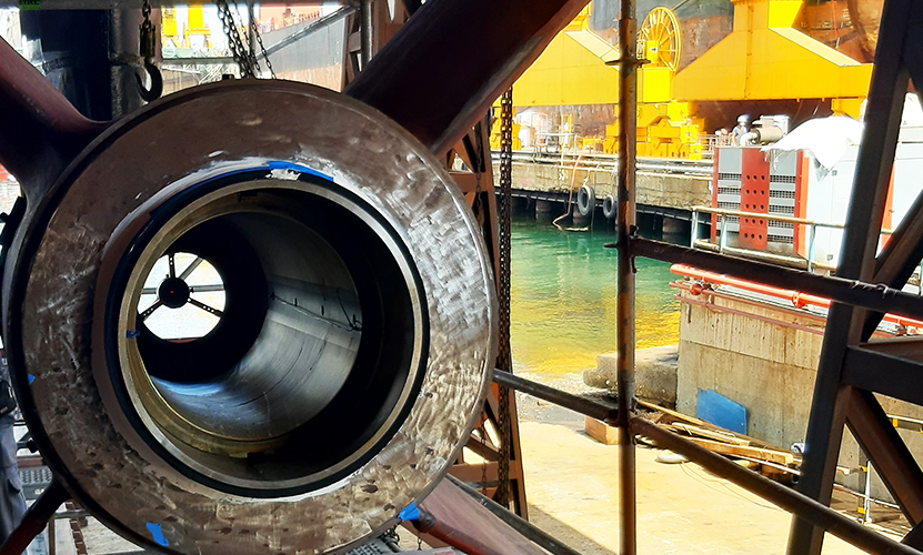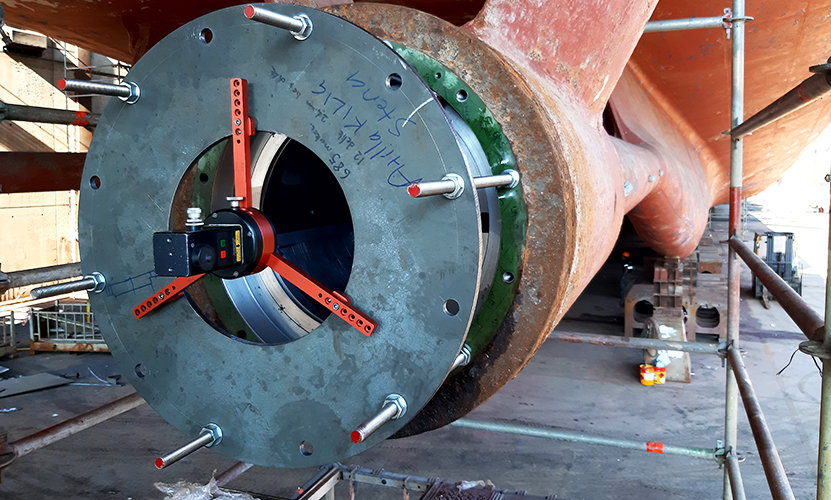 The alignment of bearing journals in relation to the stern tube (or gearbox) is carried out using Linebore equipment, where the laser transmitter is mounted on the axial surface at one end of the stern tube (or the gearbox flange) and the detector unit is placed in the bearing position. Measurement values are recorded in two positions for each bearing position (the detector unit is rotated through 180°), the measurement program calculates and then displays the position in the vertical and horizontal directions.